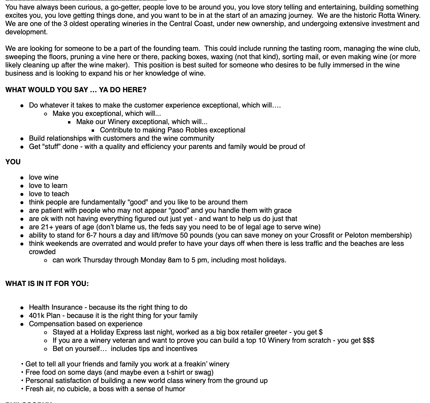 A good test of these 3 principles came up when authoring our first job posting. I collected all of the examples I could find from fellow wineries and tried to merge them all together. It took hours. I was struggling. I felt the life and enjoyment leaving me with every key typed. So I stopped and reflected for a minute. “This is our winery and we don’t have to be like everyone else. What is the job YOU would want? What would be authentic?”